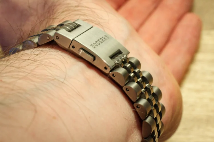 - The lack of micro adjustment holes in the clasp is a serious over-sight. Whilst I remind myself that this is a $150 watch, since Boderry went to the trouble of machining the Titanium folding clasp, it does not seem too much of a stretch to expect some micro adjustment positions to make the bracelet far more adjustable. Especially considering the awkward split-pin link solution.