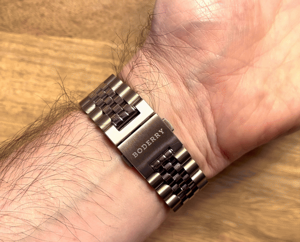 - The small double button clasp is impressive to look at on face value, but generally, these smaller clasps required a butterfly style deployant solution to keep the clasp body small, but allow enough physical space when open to remove the bracelet from your wrist. Whilst the Boderry clasp has a very low apparent footprint, the mechanism below is much longer and off centre. This means you have to position the visible part of the clasp off-centre on your wrist to give the mechanism below enough space to sit on the flat part of your wrist. It seemed unnecessary, and coupled with the decision not to offer micro-adjustment, this clasp is a serious compromise in functionality for minimal aesthetic benefits.